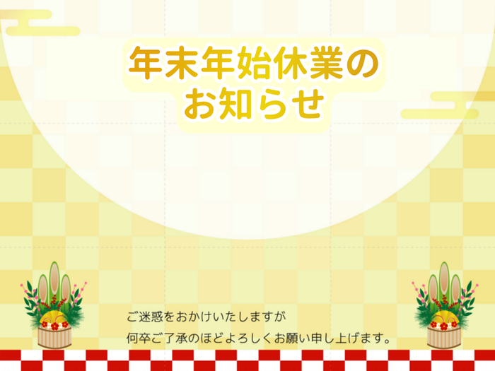 さて、年末年始にあたり、誠に勝手ながら下記の期間については、東京本社・九州支店ともに冬季休業とさせていただきます。休業期間中、お客様には大変ご不便をお掛けいたしますが、何卒ご了承くださいますようお願い申し上げます。